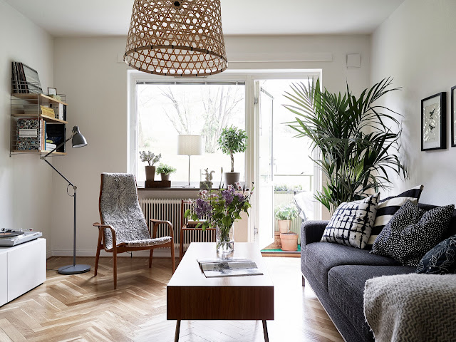 No le vamos a negar a los suecos el buen gusto que tienen para decorar después de ver este bonito apartamento. Lo que más me llama la atención en mucha de la decoración nórdico es la falta de cortinas, cosa que en parte entiendo, ya que ellos no tienen esa intensidad de luz que vemos ahora mismo durante todo el año y una cortina quita mucha luz. Será mi defecto de tapicero y siempre echo de menos aunque sean unos visillos que vistan del todo la estancia.