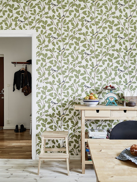 Saben que me gusta recordaros que es lo que más me gusta de la casa y en esta casa lo he tenido fácil: el papel que decora con tanta alegría y naturalidad la cocina de la casa. La verdad es que el mercado hoy día nos da muchas posibilidades con el papel pintado, hay miles de diseños para todo tipo de usos, infantiles, naturales, de rayas, estampados, texturas… cualquier cosa. Aquí se ha conseguido una mezcla ideal de colores: blanco, madera, negro y el verde a través del papel pintado y a las plantas que tiene distribuidas por toda la cocina. Vean ustedes, seguro que os gusta tanto como a mi.